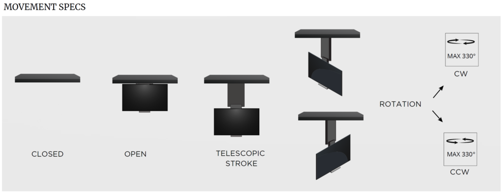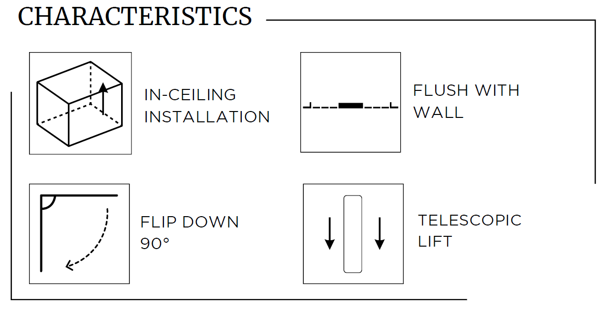 Diese Reihe von Mechanismen ermöglicht es, den Fernseher direkt an der Decke zu installieren. Diese Art von Bewegungssystem kombiniert Funktionalität und Design und bietet die Möglichkeit, den Fernseher vollständig zu verbergen und zu verstecken, indem er in seinem Gehäusefach verschwindet und einen eleganten, wandbündigen Effekt erzeugt. Zusätzlich zur Flip-Down Serie fährt der TV-Lift auch nach unten.